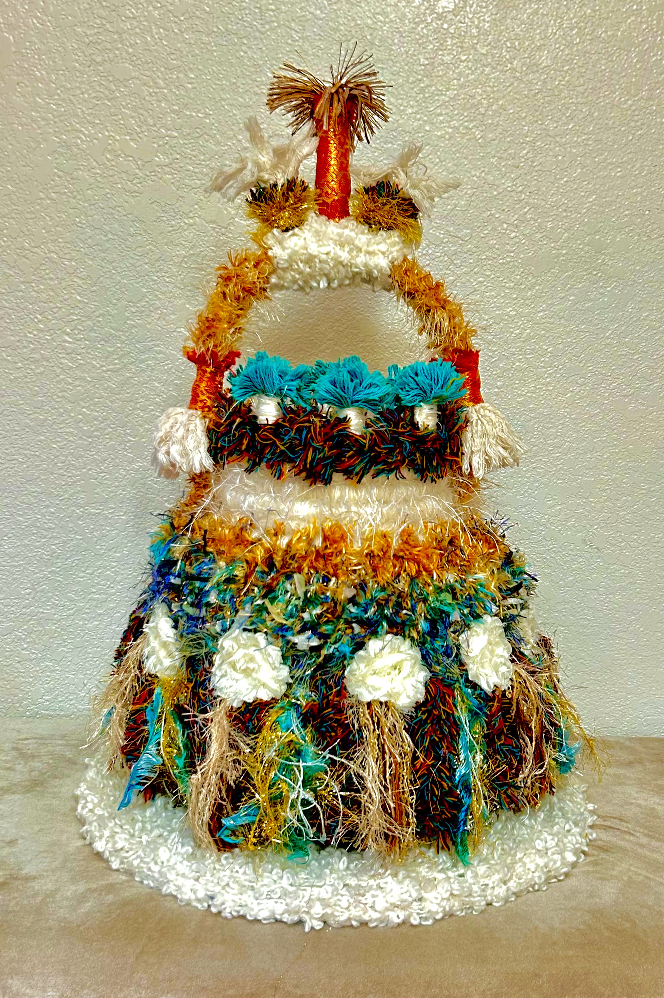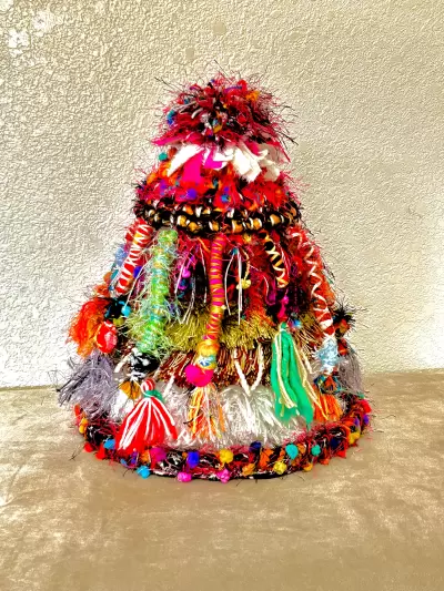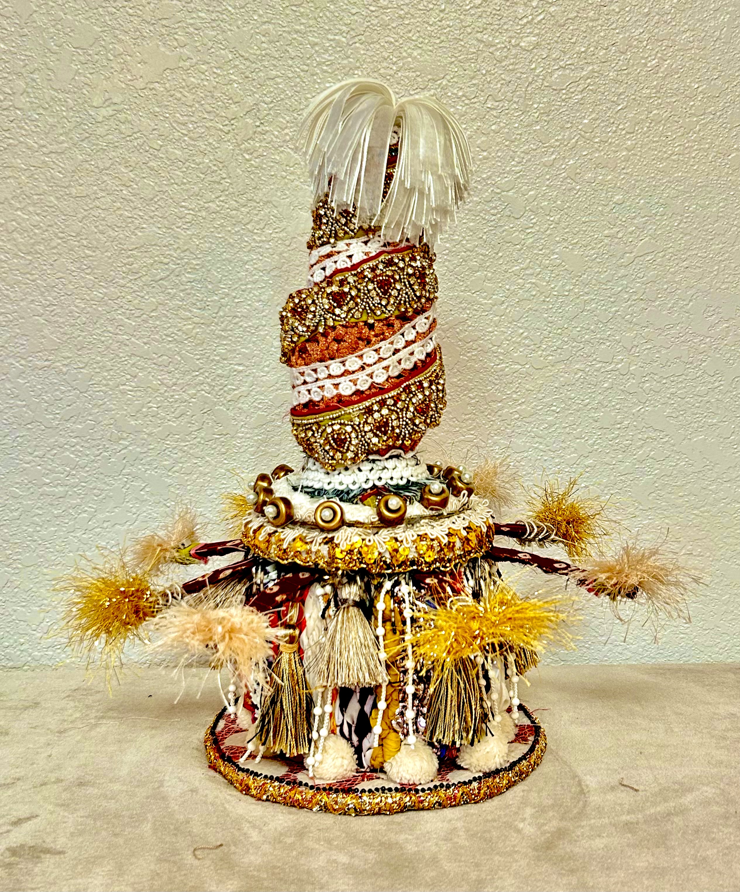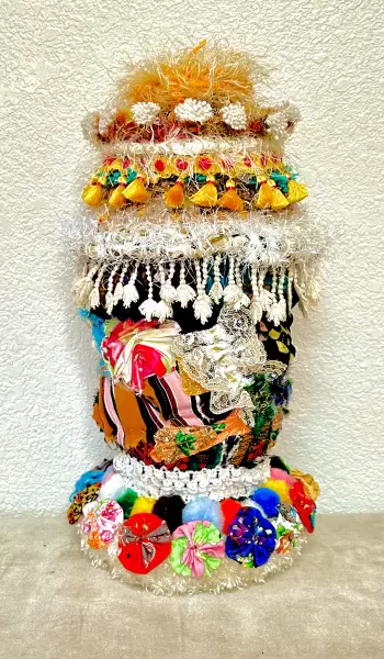 You'll begin with creating a stuffed cylinder, using fabrics that speak to you. You'll then build a base and a top, shaped as you choose it to be. Then, you'll learn many techniques for going all out with decorating and embellishing it. This can include all kinds of wrapping of various objects to hang on your piece, as well as tassels, fringe, pompoms, and so much more. No art or basket-making experience is necessary and all levels are most welcome. (Please note that the techniques taught in this class are completely different from my "Vivacious Vessels" workshop).