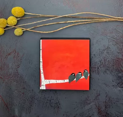 Folk Art Painting: Birch Trees and Chickadees.
