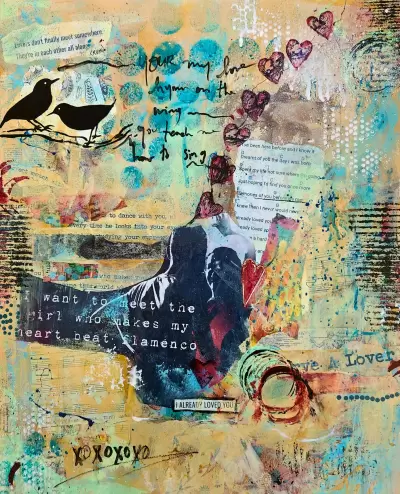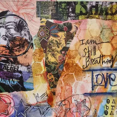 Included from Pamela’s art studio are shared supplies such as collage papers, gel medium, various mark-making mediums, as well as rubber stamps and stencils.