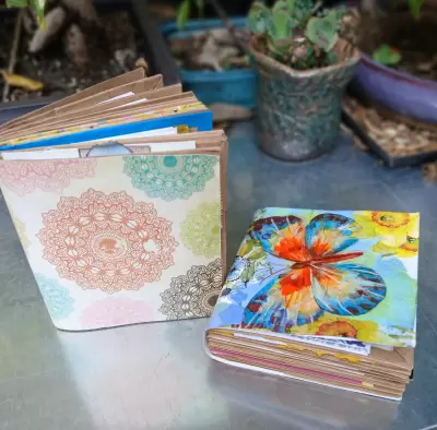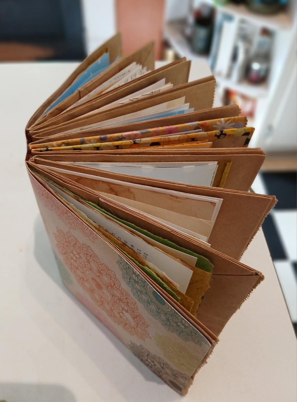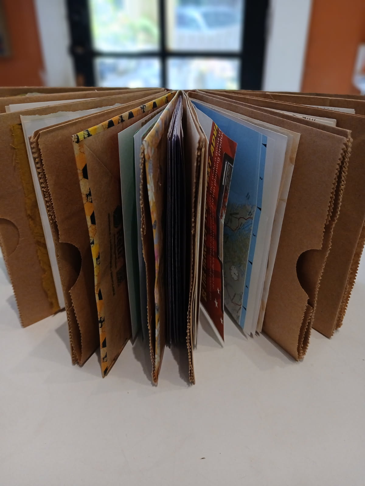 Let’s make something beautiful and meaningful using paper bags, pretty paper, old pages, and other ephemera. I’ll show you how to sew some simple signatures using various plain, printed, and handmade papers, as well as paper lunch bags. I will have paper, waxed thread, bone folders, needles, and other tools available for students to use. We will attempt to sew 10 signatures and also make a decorative, collaged cover for our journal. Once assembled, we’ll use a fancy ribbon or strap system to keep our journal closed. This journal will have lots of pockets for your treasures. Feel free to bring anything you’d like to incorporate into your one of a kind personal journal. This is a great way to incorporate personal mementos into a small handheld piece of art. This class is beginner friendly.
