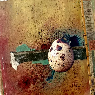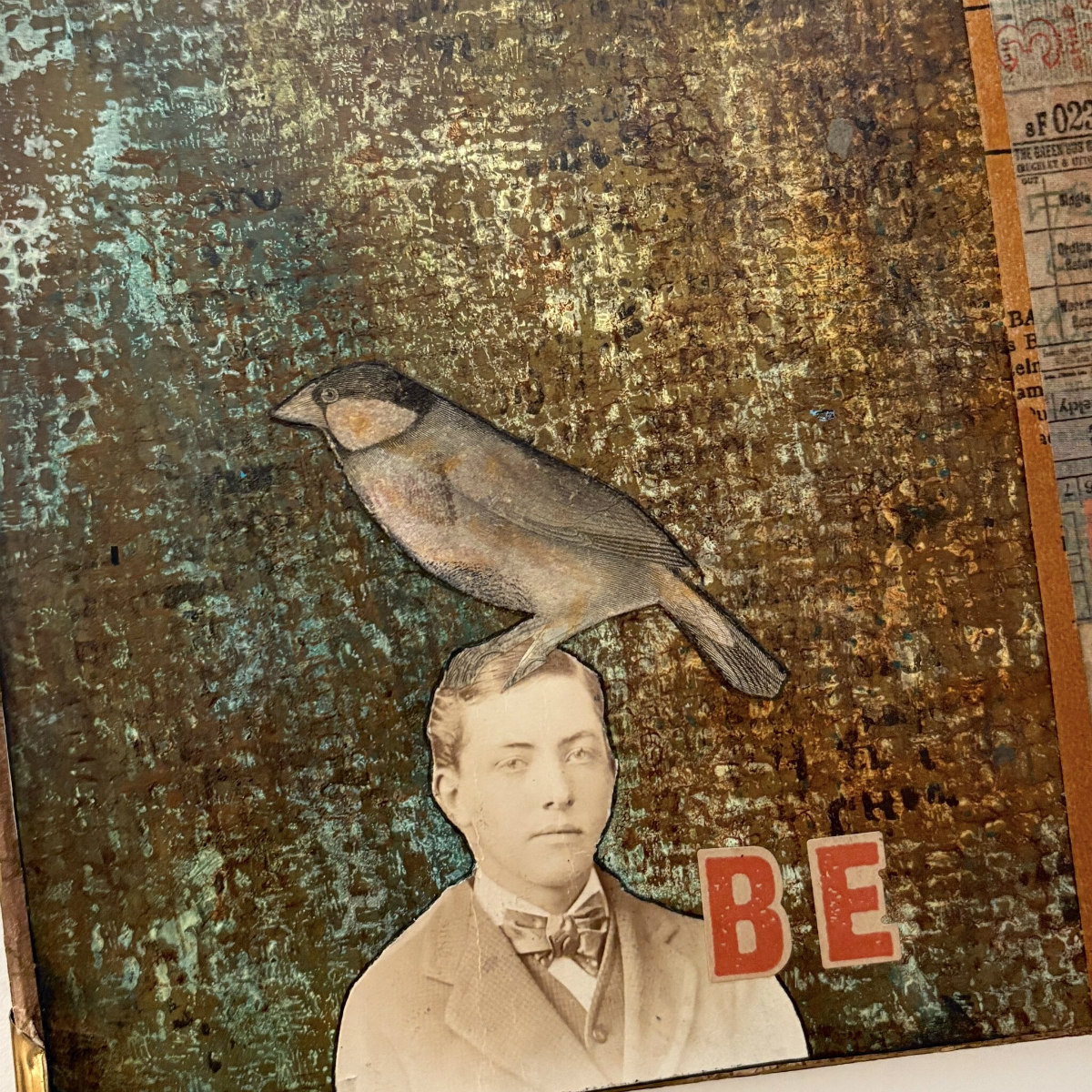 Collage material. Anything goes but consider such things commercial decorated papers, vintage ephemera, fabric scraps, decorated tissue, die cuts, your own small drawings, vintage book pages, hand painted and/or gel plate papers, rub-ons photographs, etc.