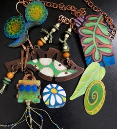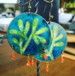 In addition to the coloring techniques, your instructor will delve into easy-to-follow Color and Design theory with tips and tricks for getting harmonious combinations, a few simple metal forming techniques for breaking free from “the flats,”and easy joining ideas for turning your works of art into a wearable. Don’t worry if you “can’t draw” – we have a large selection of inspirational patterns and stencils on hand for the timid! Depending on your speed and skill level, you will complete a pair of earrings and/or one pendant or focal element in class