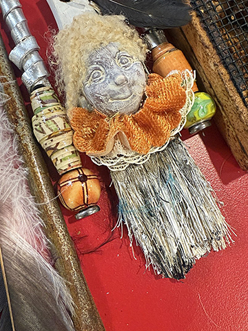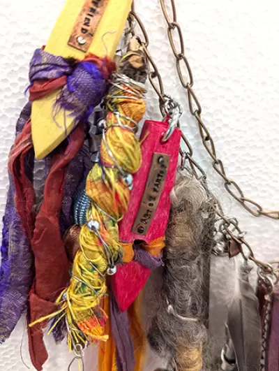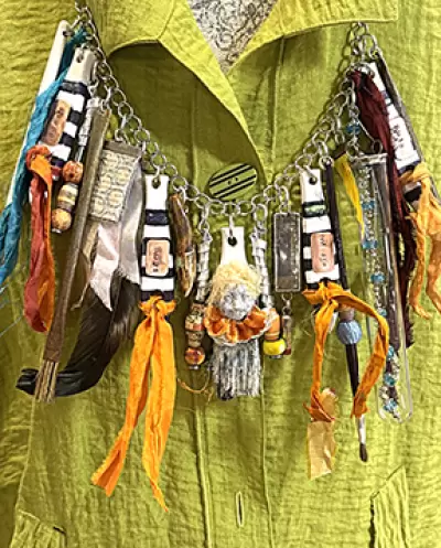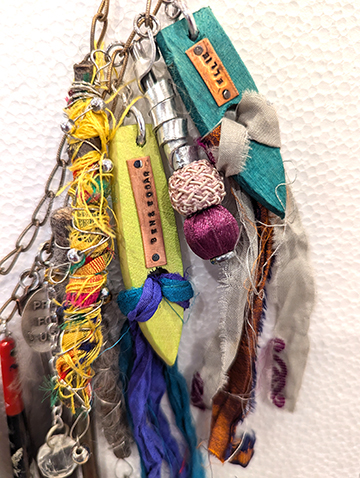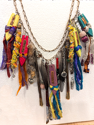 In case people have a hard time knowing an artist when they meet one, this piece should definitely help you assume the role in public. Gather your tap shoe parts, paint brushes, torn silk blouses, old earrings, beads, sticks and stones, fishing lures, charms and sequined trims. The instructor will have lots of stuff, but definitely bring some of your own. We are gonna make something arty farty to wear or hang on a jewelry wall. Everyone has a jewelry wall, right? I love wearing mine, because I get to meet at least one new person who also shares a love of art. Perfect.