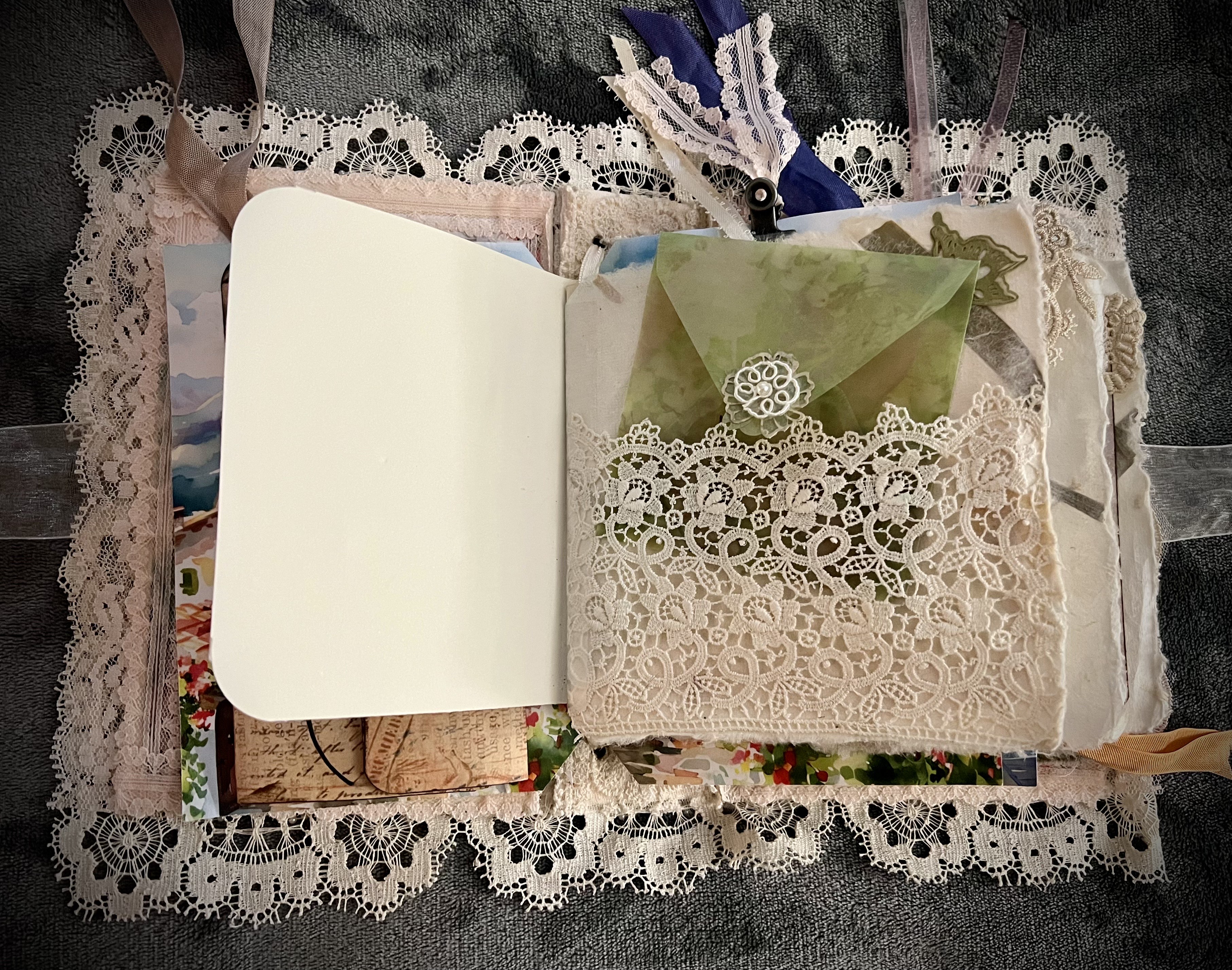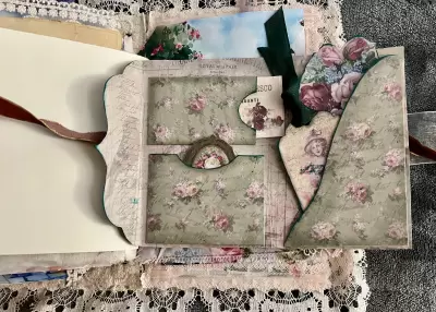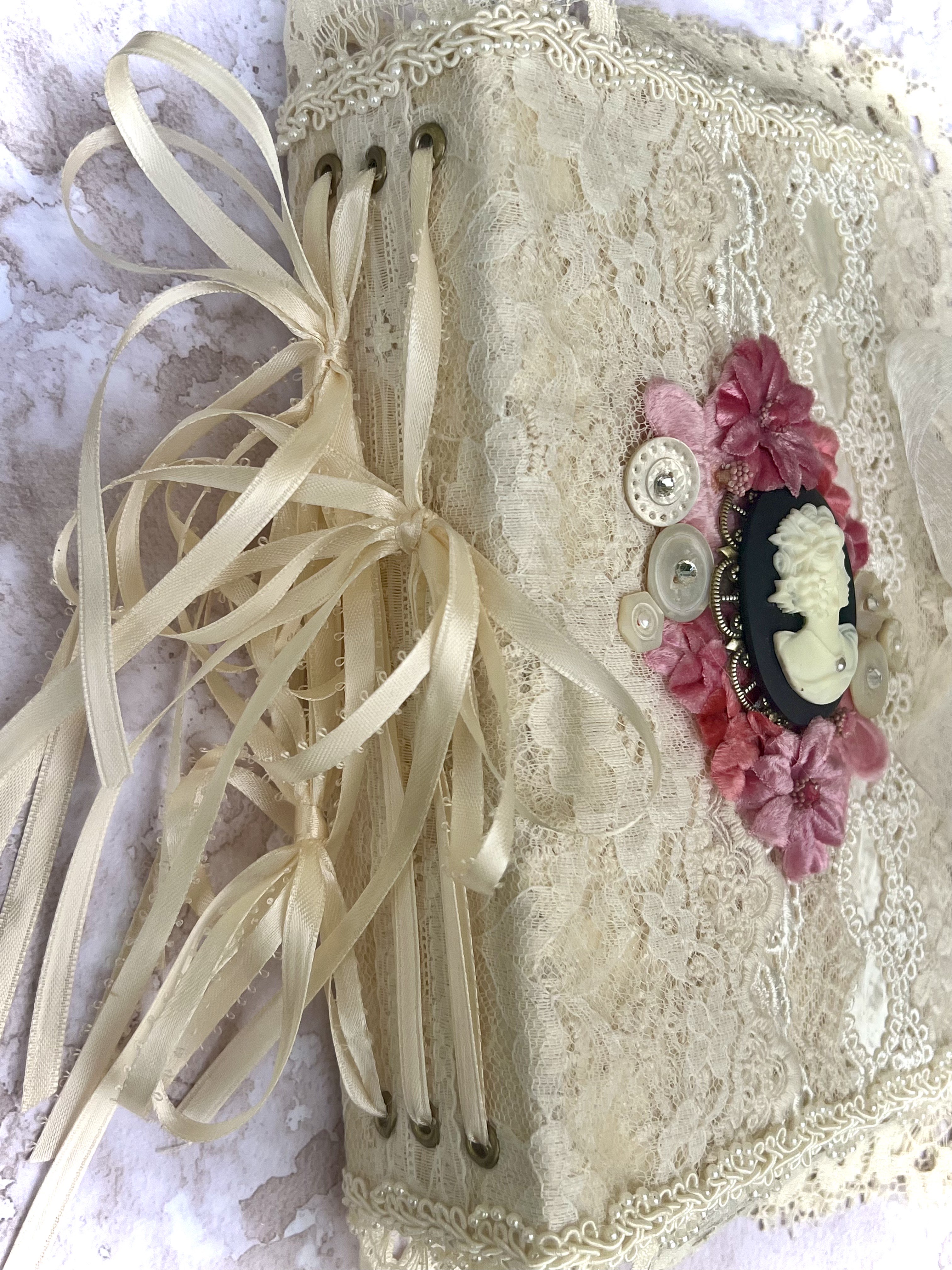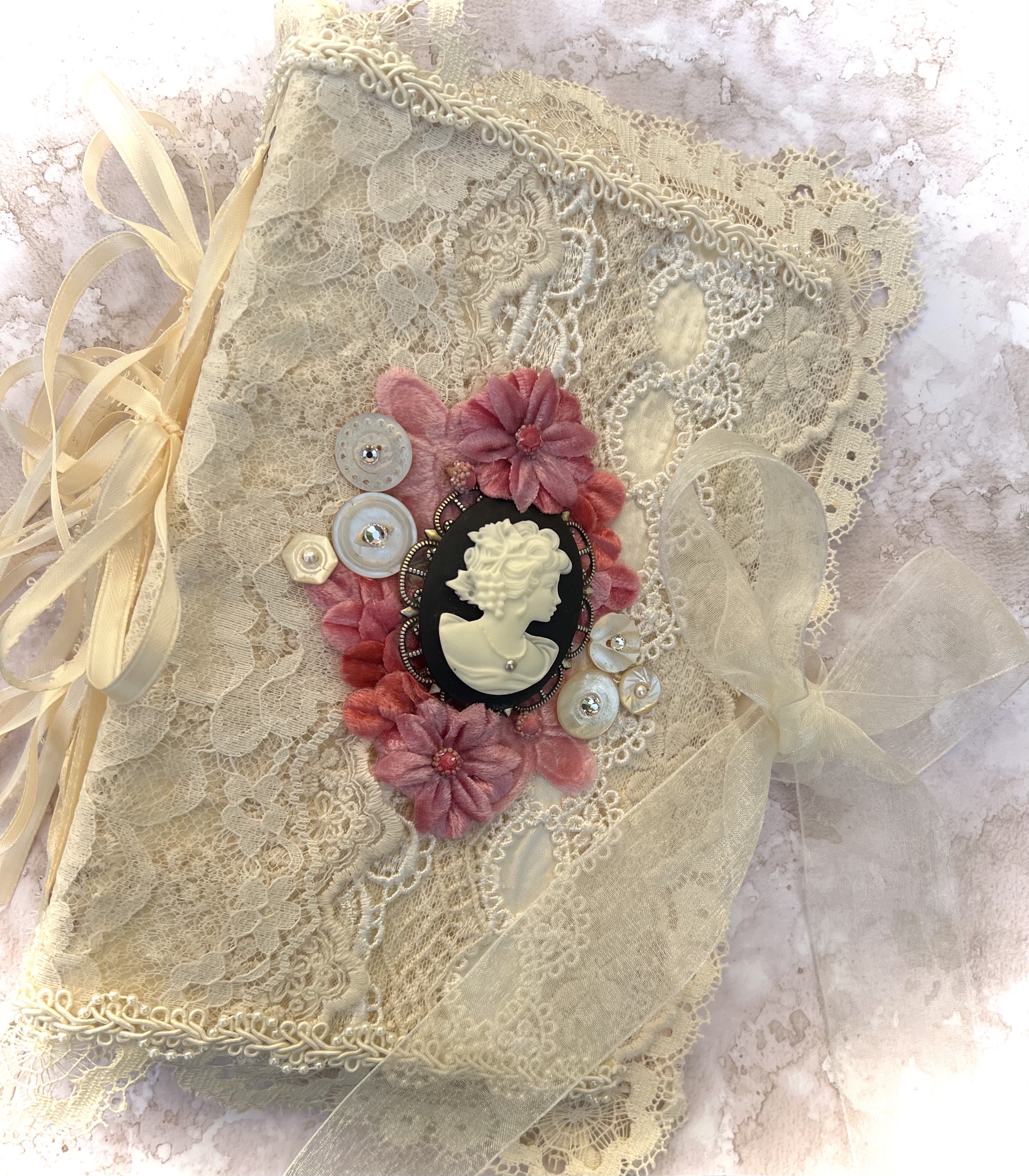On the first day of class we will construct a “No Sew” Journal with a mixed lace cover, plus a spine which allows pages to be inserted and removed. If you would choose to create a more rustic antiqued journal we will cover ways to add this effect.