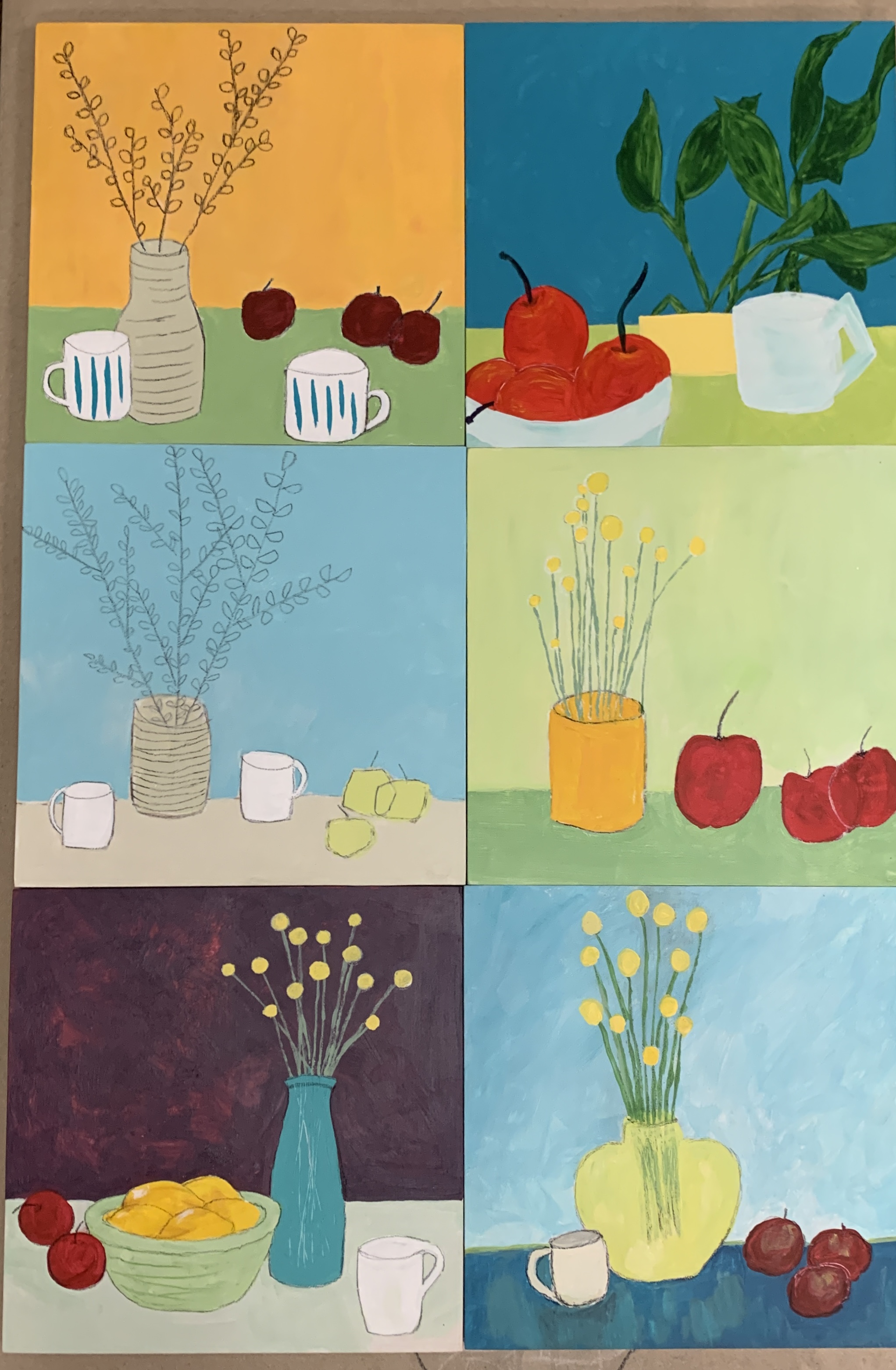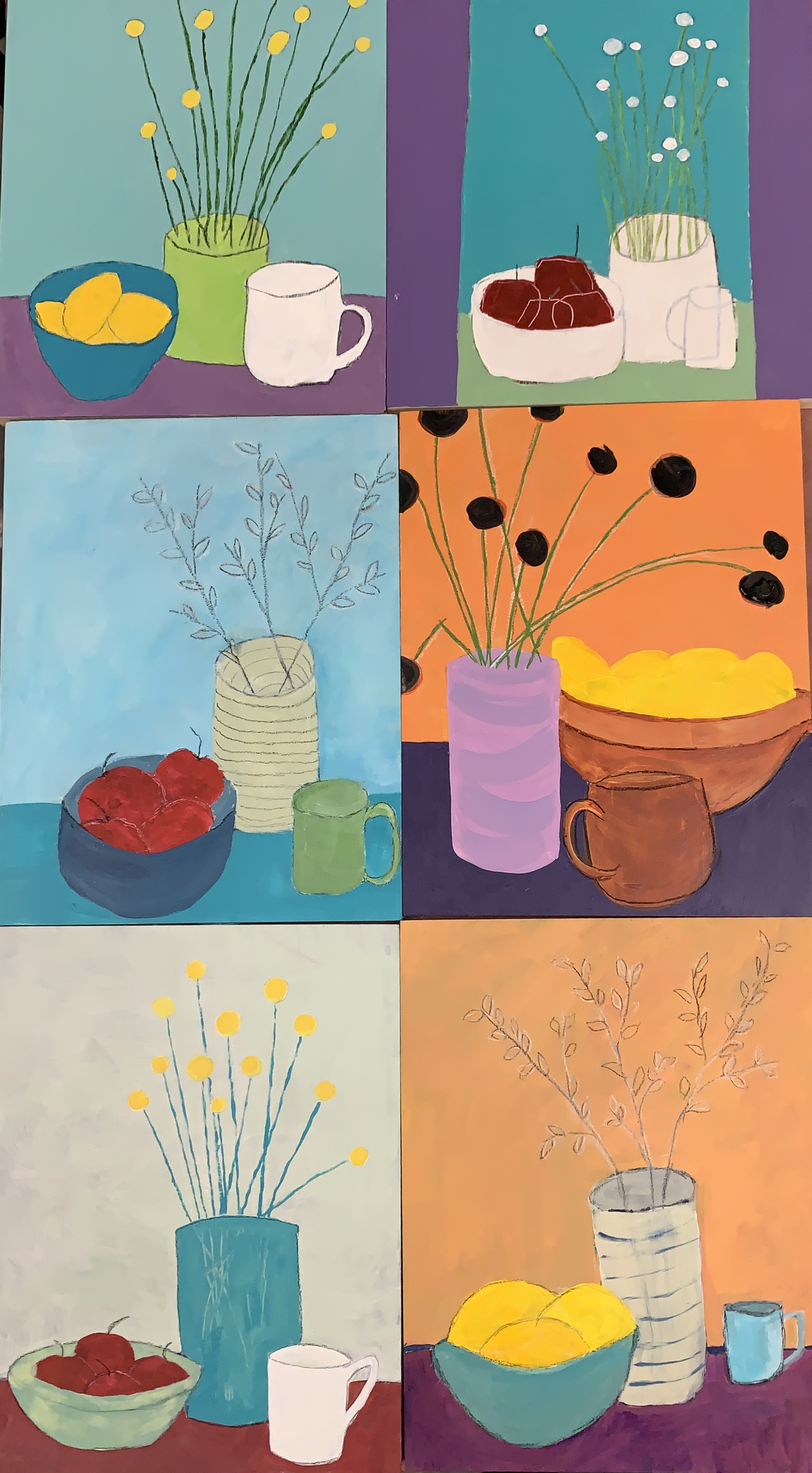 We will use acrylic paints, which dry quickly, and practice one of my favorite techniques (carving into wet paint), and use both negative space and overlapping objects to create calm distinctive paintings.