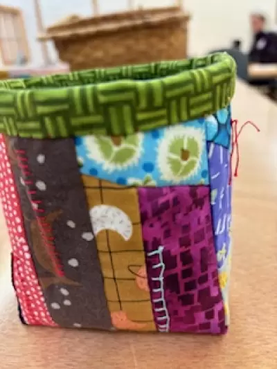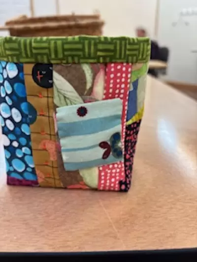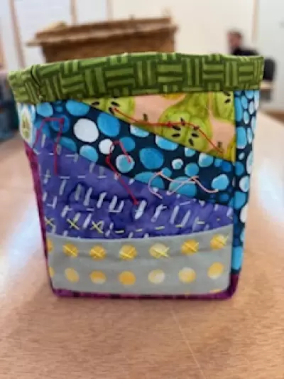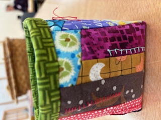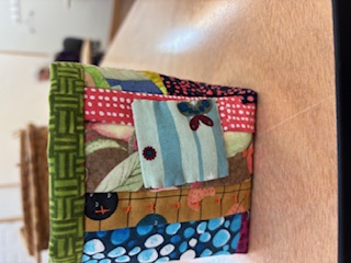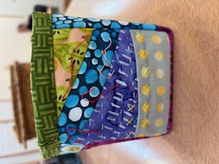 These are 4”x4” bags made entirely of scraps. They are embellished with sashiko stiching/ lined with separate fabric/ finished with bi ding and a pocket for treasures.