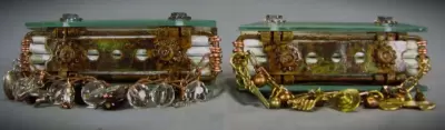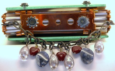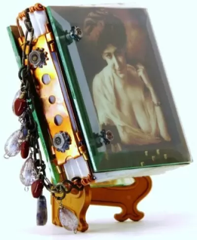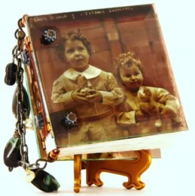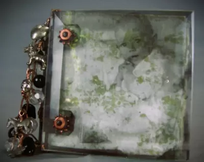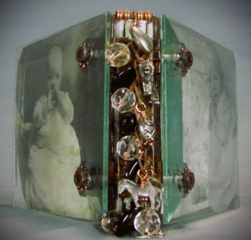 This precious little book is a beautiful union of form and function. Copper, wire, paper, and beveled glass come elegantly together in this charming little book that is sure to become a treasured keepsake, especially once it is filled with your art photos and writing. In this workshop you will fabricate the new and improved version of my original all metal binding with two 4" beveled glass squares as the covers. Fill it with some nice watercolor paper, and it is perfect for writing, art journaling, scrapbooking, whatever! Students fabricate the glass and metal book completely "from scratch" and embellish with chain, beads, charms, and pretty photo images. This unique binding, once mastered, can be adapted to many other materials. Two transparencies of cute/pretty vintage photos are included in your kit, but you can bring a more personalized image for the covers. Just print out any 2 photos you like on transparency film at 4.25" sq. just do not cut them out. Glass squares come pre-drilled for the workshop, but bring your own Dremel and a 1/8" diamond drill bit if you want to try your hand at drilling some glass in class. Techniques you'll learn include drilling the glass bevels, some cool metal fabrication, how to alter metal with fire and chemical patina, some basic bookbinding terminology, safe use of various hand tools, and more! More info on tools and supplies can be found at www.blacksheepartist.com